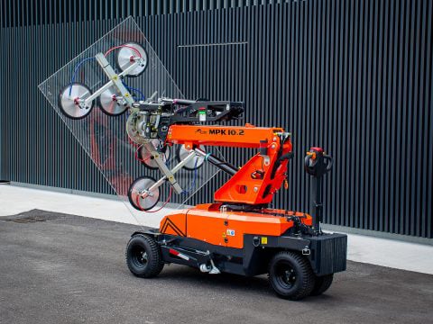Discover MPK10.2, the 2,180 lbs full electric 2in1 minipicker: an extremely compact glass robot and pick & carry crane all in one machine. The new improved vacuum manipulator with modular and customisable layout allows to easily position glass, marble, monopanels or smooth panels of any kind.